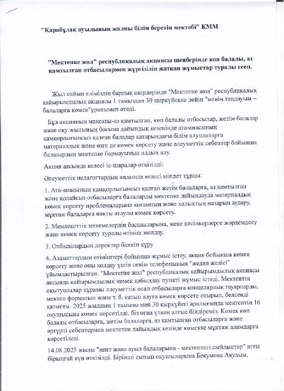 "Мектепке жол" республикалық акциясы шеңберінде көп балалы, аз қамтылған отбасылармен жүргізіліп жатқан жұмыстар туралы есеп.